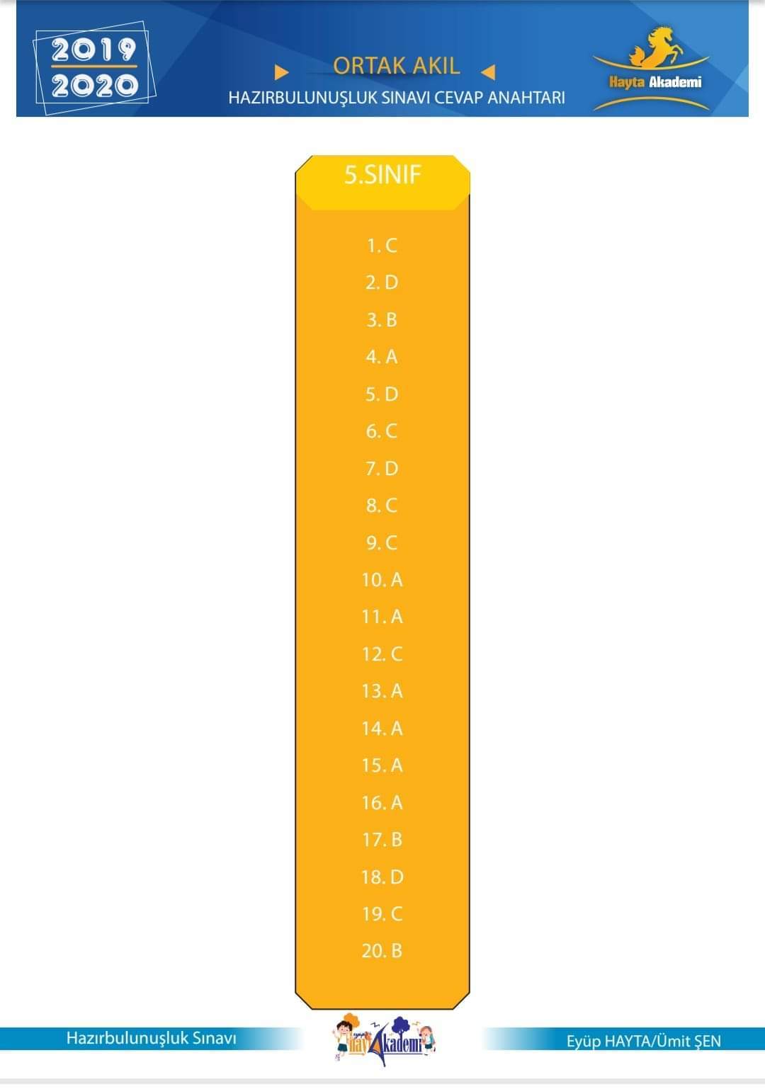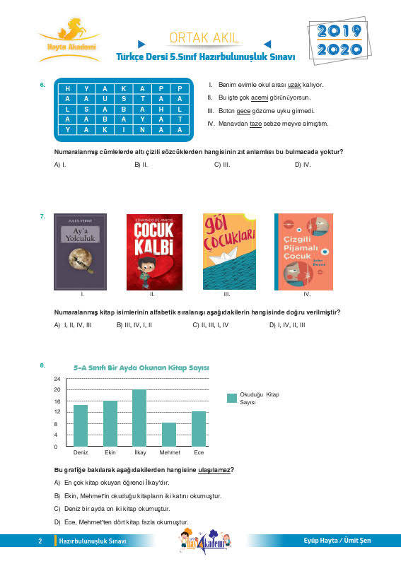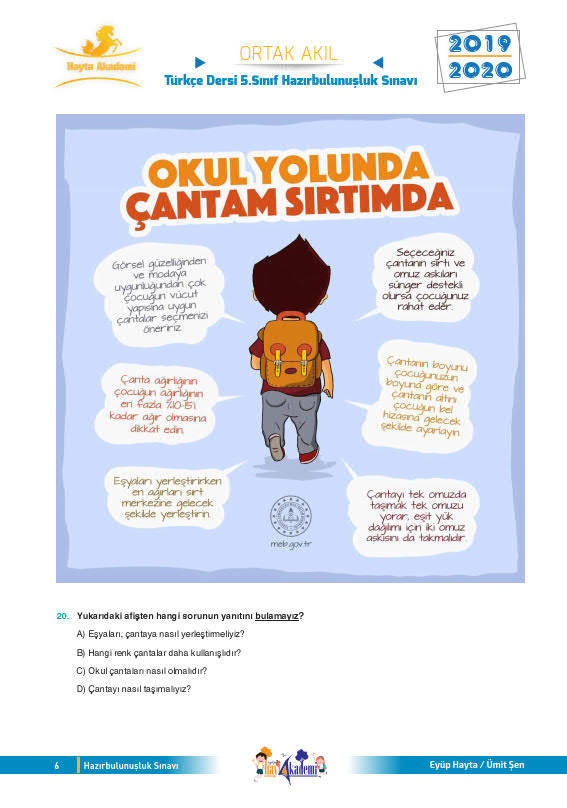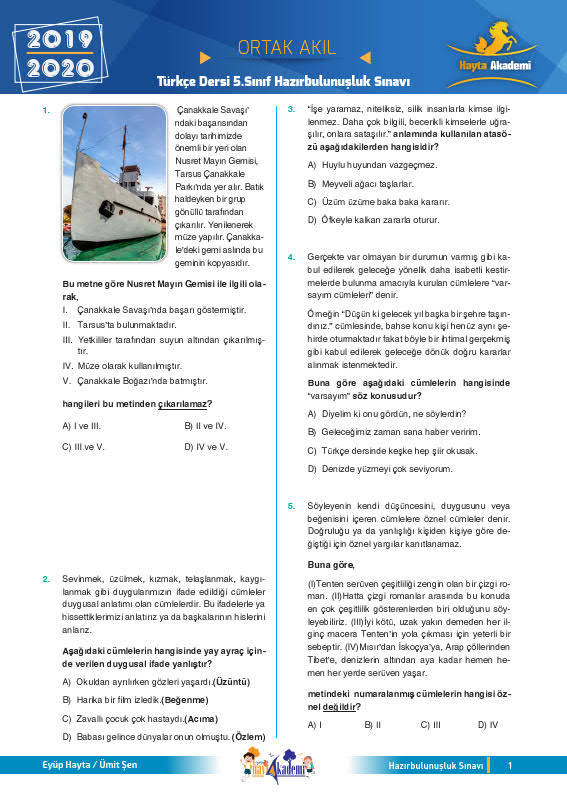 Eyüp HAYTA ve Ümit ŞEN tarafından hazırlanan 5. sınıf hazırbulunuşluk deneme sınavıdır. İçerisinde kelimede anlam, cümlede anlam, paragrafta anlam, görsel okuma, atasözleri, noktalama işaretleri, sözel mantık gibi pek çok konudan soru mevcuttur. 20 soruluk bu deneme ile sene başında öğrenci seviyesini tespit edebilirsiniz.