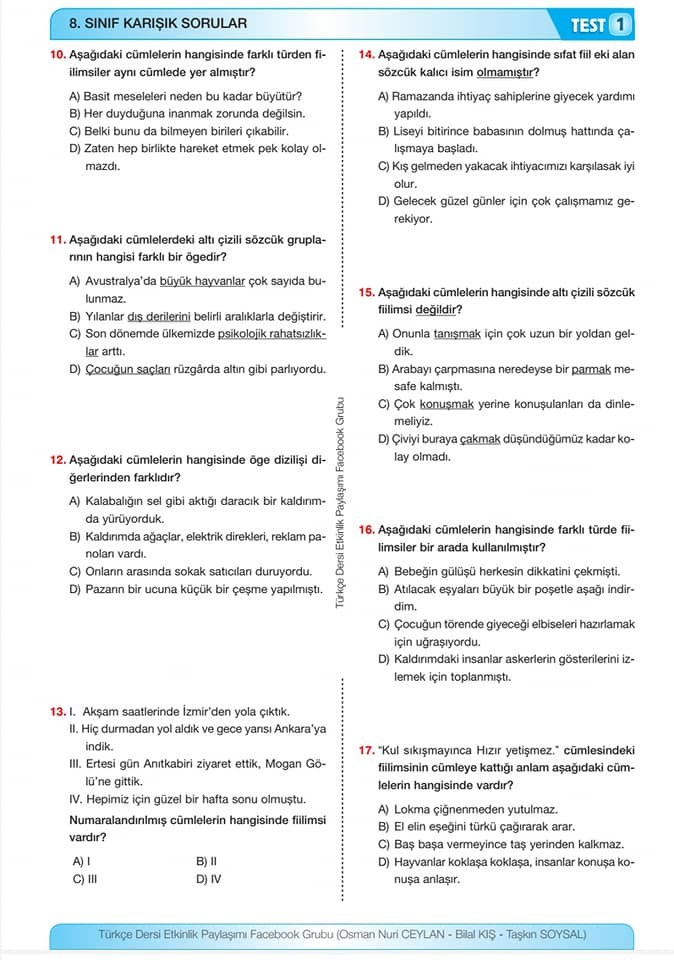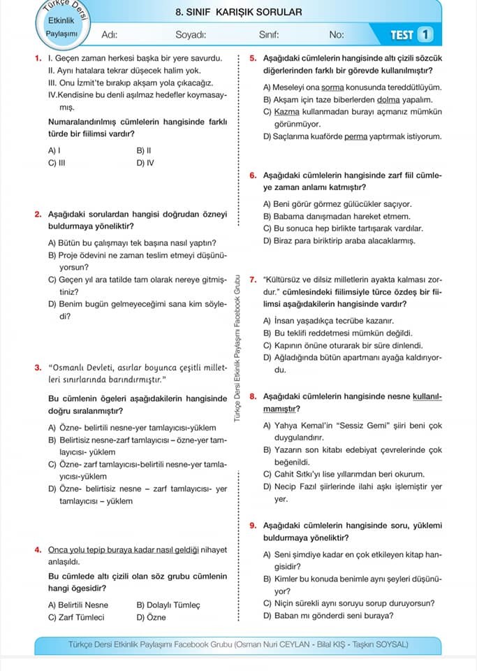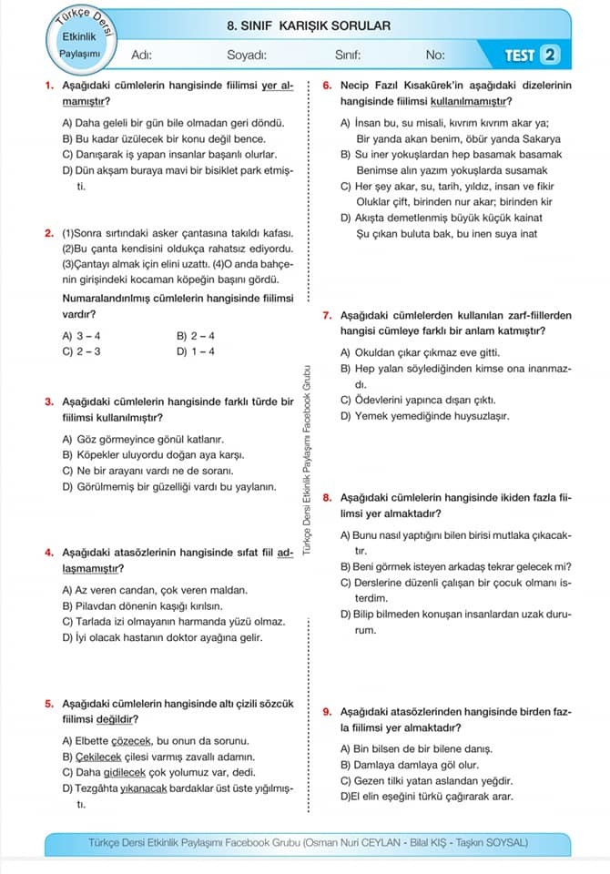 8. Sınıflar için 144 sorudan oluşan 11 adet test paylaşıyoruz. Testler Bilal Kış, Taşkın Soysal, Osman Nuri Ceylan ve Mehmet Akif Ünaldı tarafından hazırlanmıştır. 2. dönem konularını bitiren öğretmenlerimiz için çok verimli olacaktır. Bize paylaşım izni veren Bilal KIŞ’a ayrıca teşekkür ederiz.