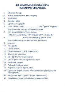 Öğretmen dosyasında bulunması gereken evrak listesi yanında kapak, iç sayfalar, ilgili mevzuat diğer tüm bilgilerin paylaşıldığı özellikle göreve yeni başlayan öğretmenlerimiz için vazgeçilmez bir kaynaktır. Dosyayı paylaşan Mehmet Şerif Varlık’a teşekkür ediyoruz.